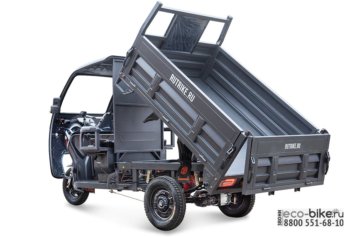 Электрический трицикл Rutrike D5 Кабина гидравлика оснащён крепким и вместительным кузовом с высокими бортами и гидравлическим подъёмным механизмом, позволяющим быстро осуществлять погрузку-разгрузку. Мощный гидравлический подъёмный привод позволяет поднимать кузов с загрузкой до 400 кг. А общая грузоподъёмность трицикла составляет до 900 кг.